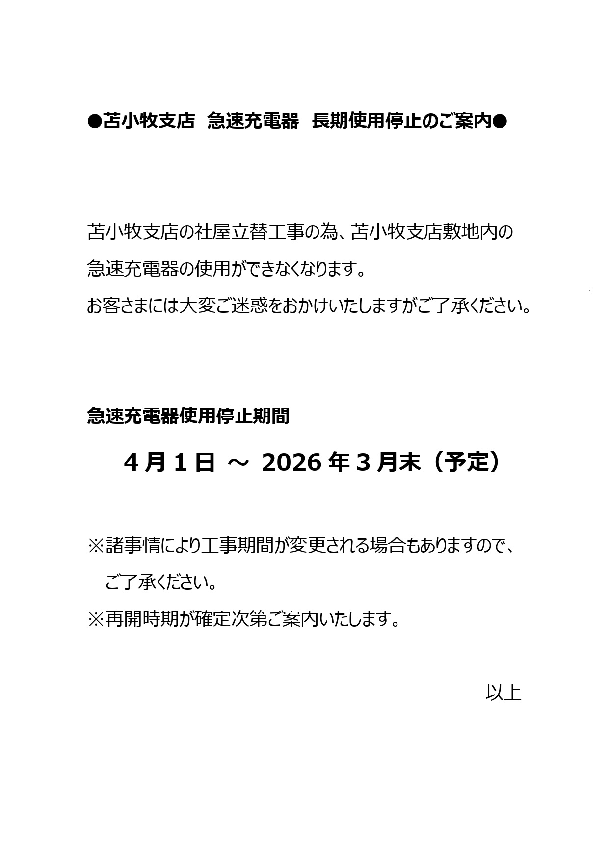 ▽苫小牧支店社屋建替え工事による急速充電器長期使用停止のご案内(2025.3.23更新)